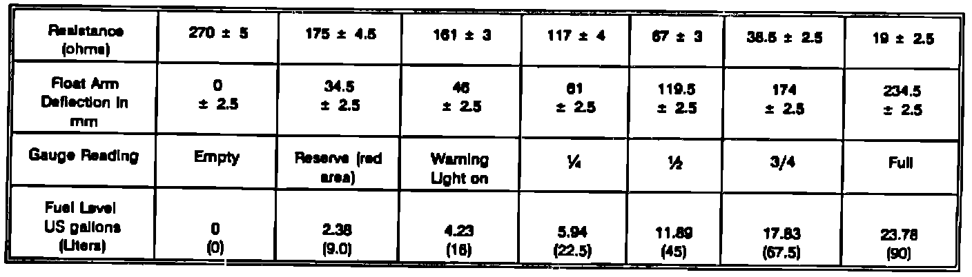 3. Using a digital multi-meter between the green/black and black leads at the plug, measure the resistance at various points and compare with the chart. Any gaps or opens in the resistance curve will cause erratic fuel gauge readings.