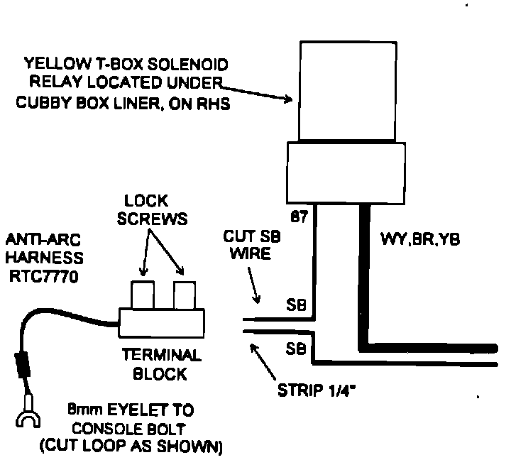 ^ Using the illustration as a guide secure the terminal block from kit RTC7770 onto the SB wires at one end and the supplied anti-arc harness wire on the other. Secure the screws.