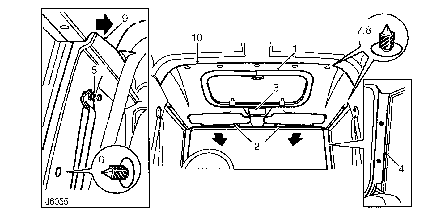 9. From both sides, pull side trim panel inwards enough to release rear corners of front headlining.