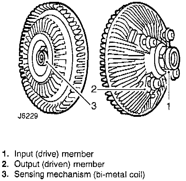 To engage and disengage the fan drive, the bi-metal coil senses air temperature behind the radiator. When a pre-determined temperature is reached, the coil opens a valve (5 in the illustration) which allows fluid to enter the drive area and, due to centrifugal force, circulates to the annular drive area.
