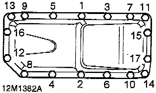 4. Install oil pan bolts and nuts and working in sequence shown, tighten to 23 Nm.