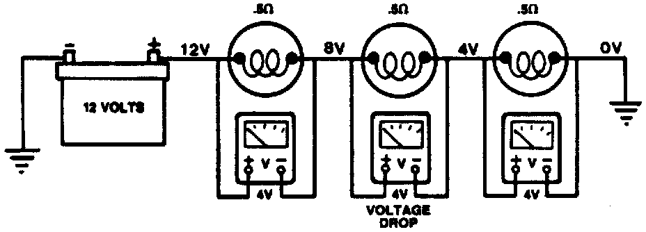 Therefore, the total volume drop in this circuit is 12 volts, which equals the battery voltage