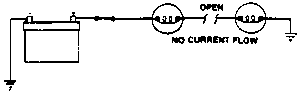 An open circuit means that there is a break or open in the circuit and there is not a complete continuous path for the current to flow through. The open may be caused by a break in a wire, loose connection, defective switch, defective load device, or incomplete ground. The open can be located on either side of the load.