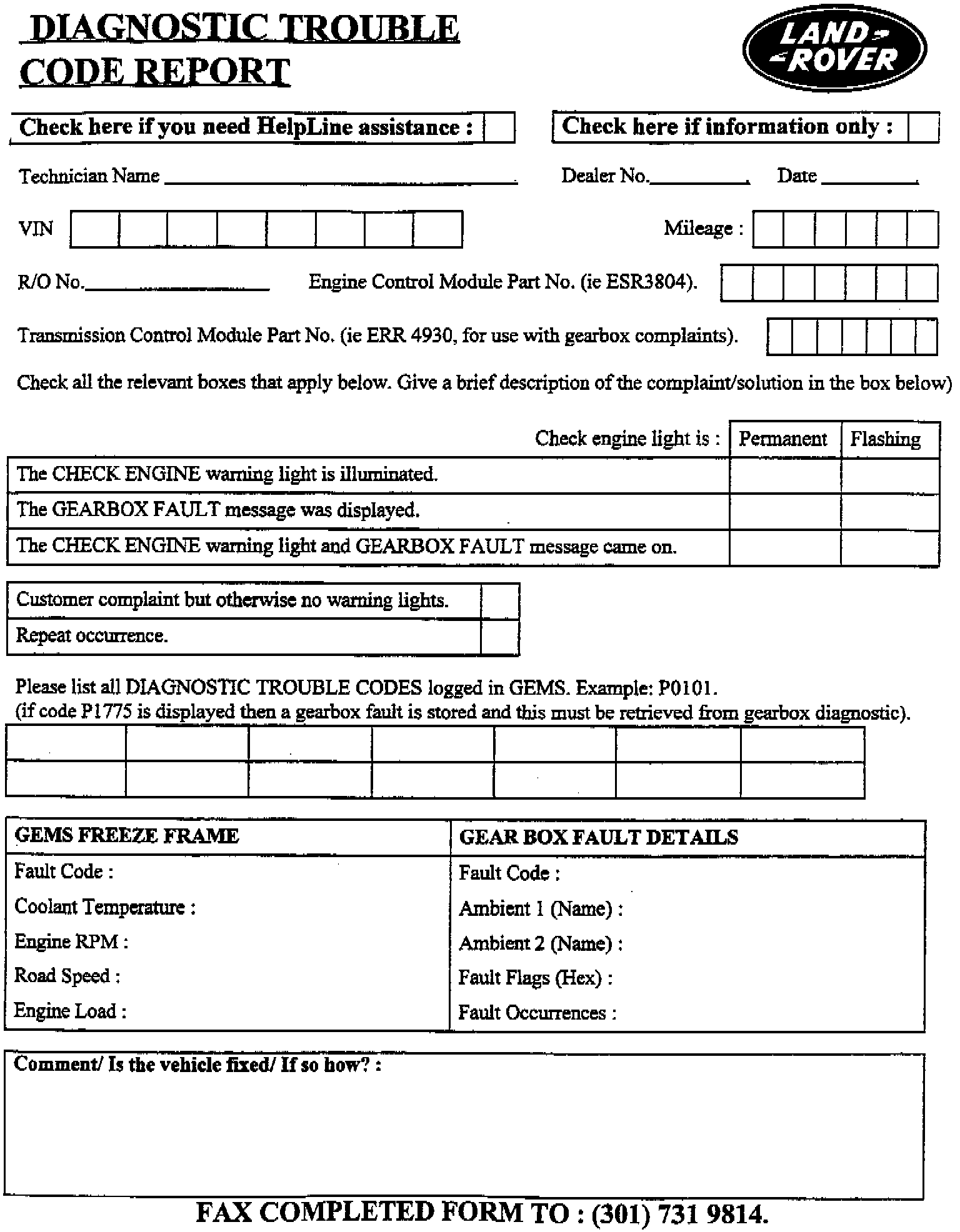 Diagnostic Trouble Code Report (DTCR) Form