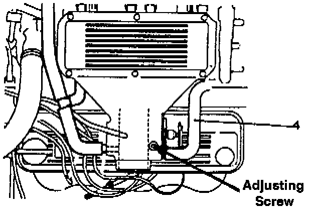 4) Connect an accurate tachometer (NOT VEHICLE TACHOMETER), clamp the idle speed control air by-pass hose and where required set the base idle to 450 - 460 RPM (adjusting screw location identified with an arrow in the figure).