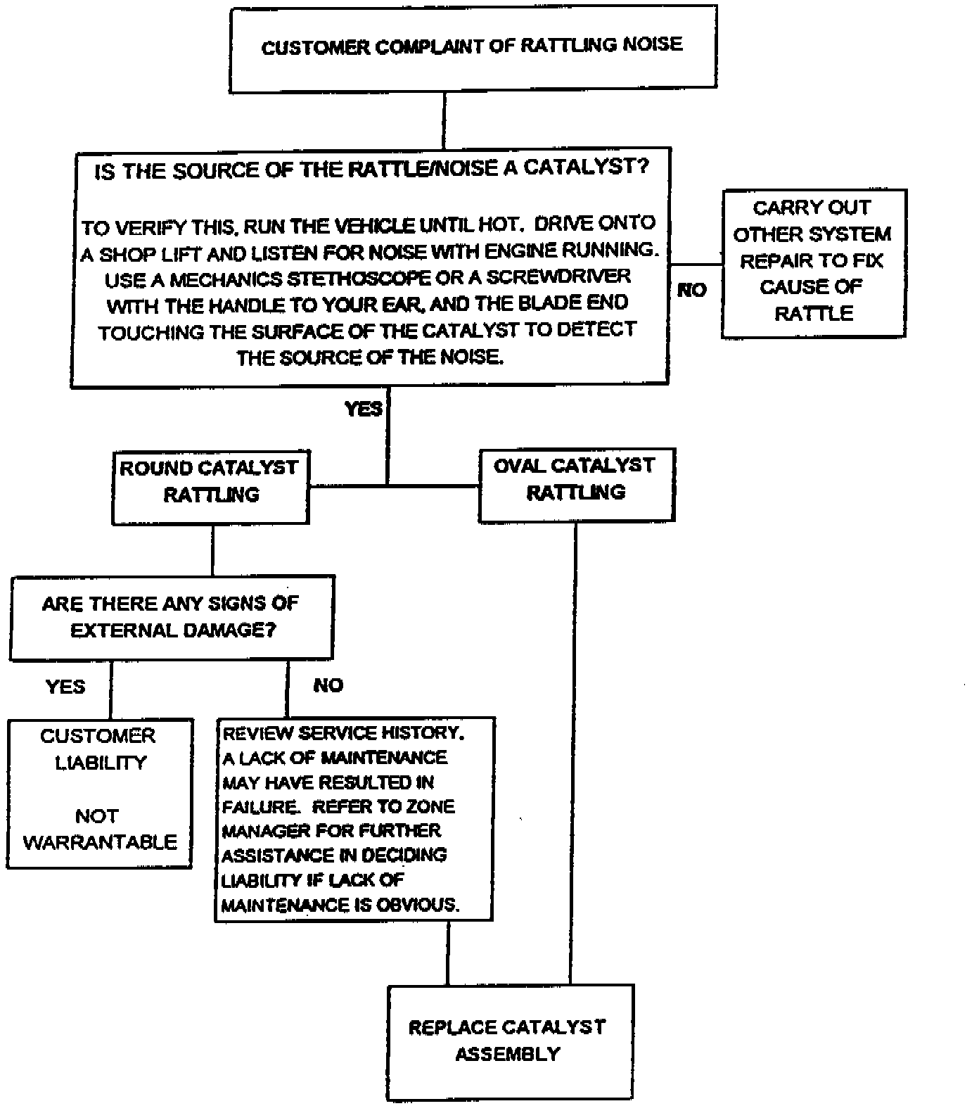 The procedure will help you determine if the source of the noise is a catalyst, and whether the required repair is warrantable. Some catalysts do suffer damage when the vehicles are used in varying terrains off-road, and this type of damage is obviously not warrantable.