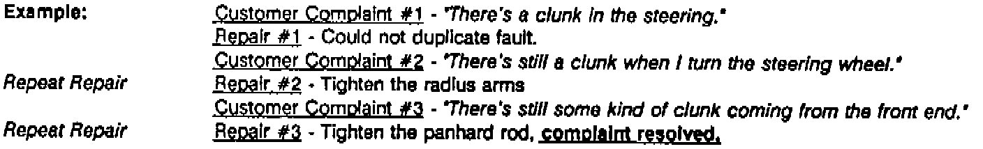 A repeat warranty repair is defined as a recurrence of the customer' complaint, not a repetition of a repair procedure. In other words, if it takes two or more visits to resolve a customer's complaint, the second and subsequent visits constitute repeat repair attempts.