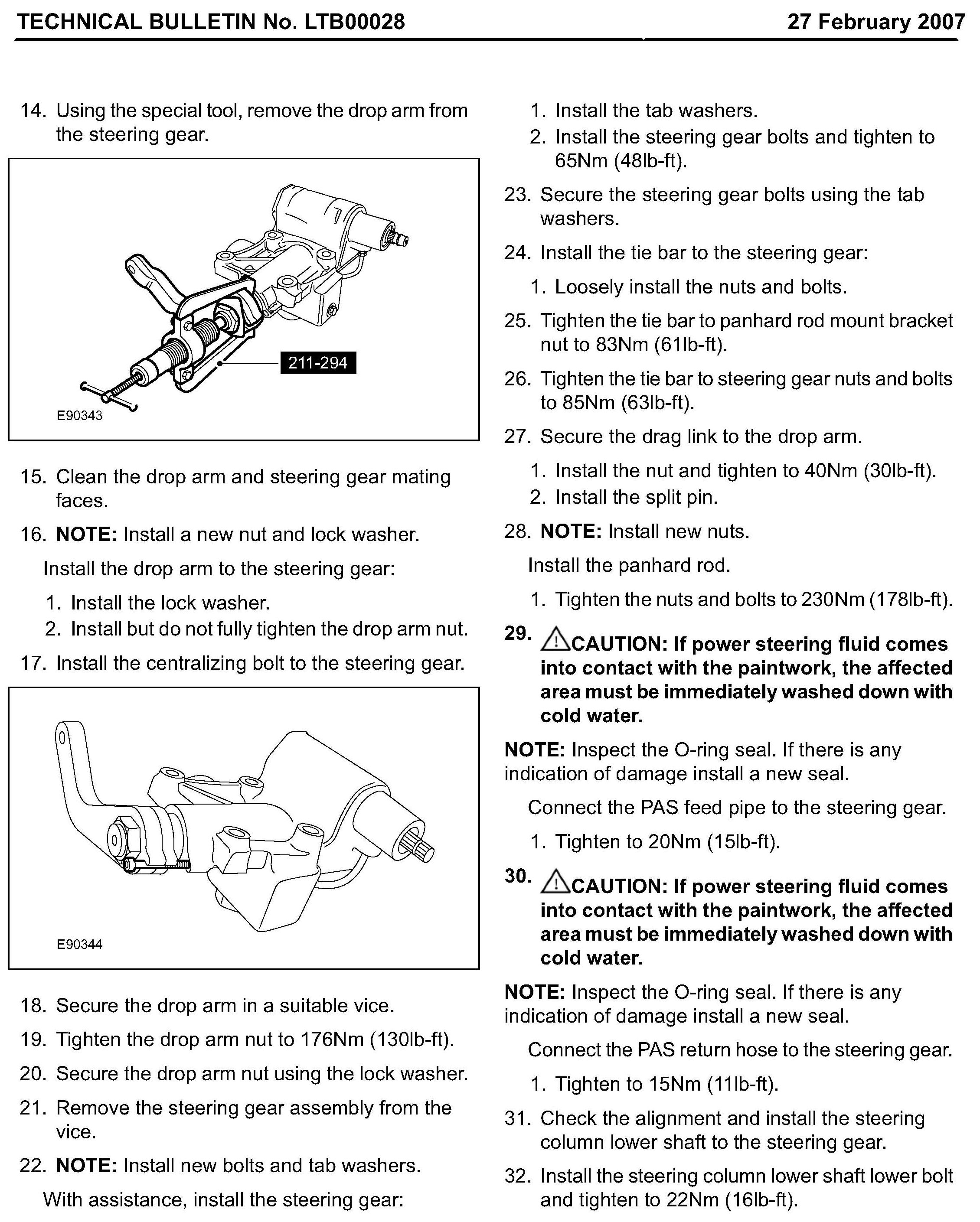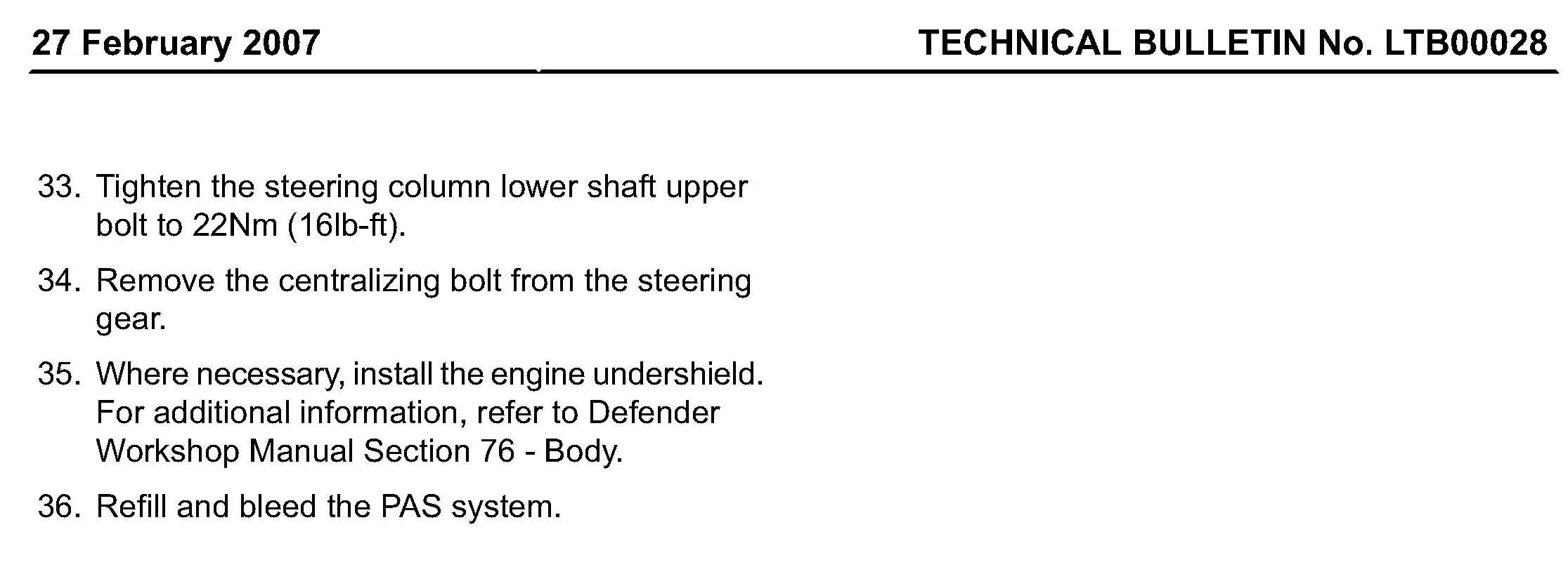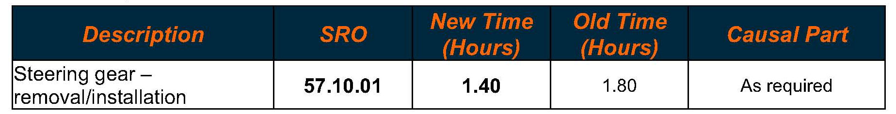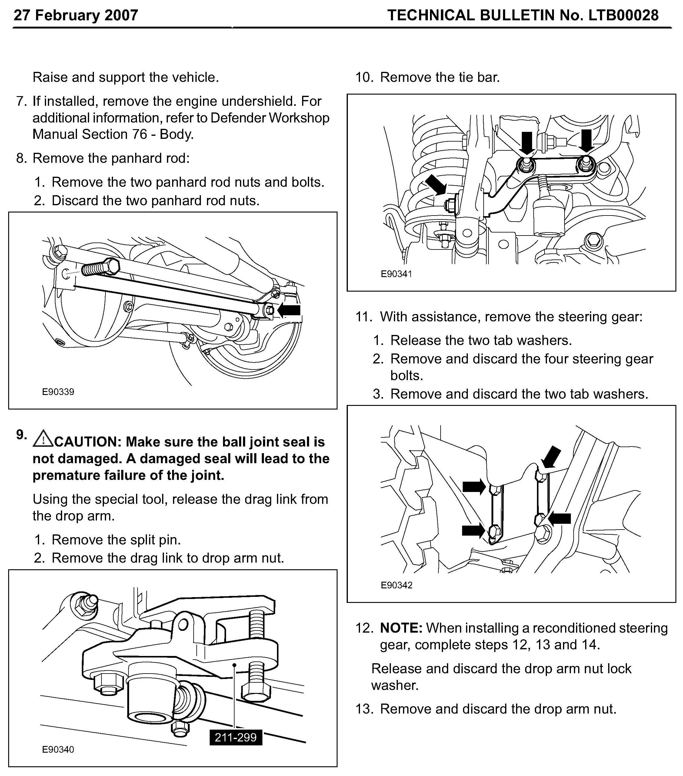 Land Rover engineers have studied the service process for removing and installing the steering gear assembly on Defender vehicles. Significant process changes have been made that refine and improve the process which allows the operation to be carried out in less time. Original service time allowed for Panhard Rod bushing removal and installation. The service time has been corrected to only allow for removal of the Pan hard Rod, not the bushings.