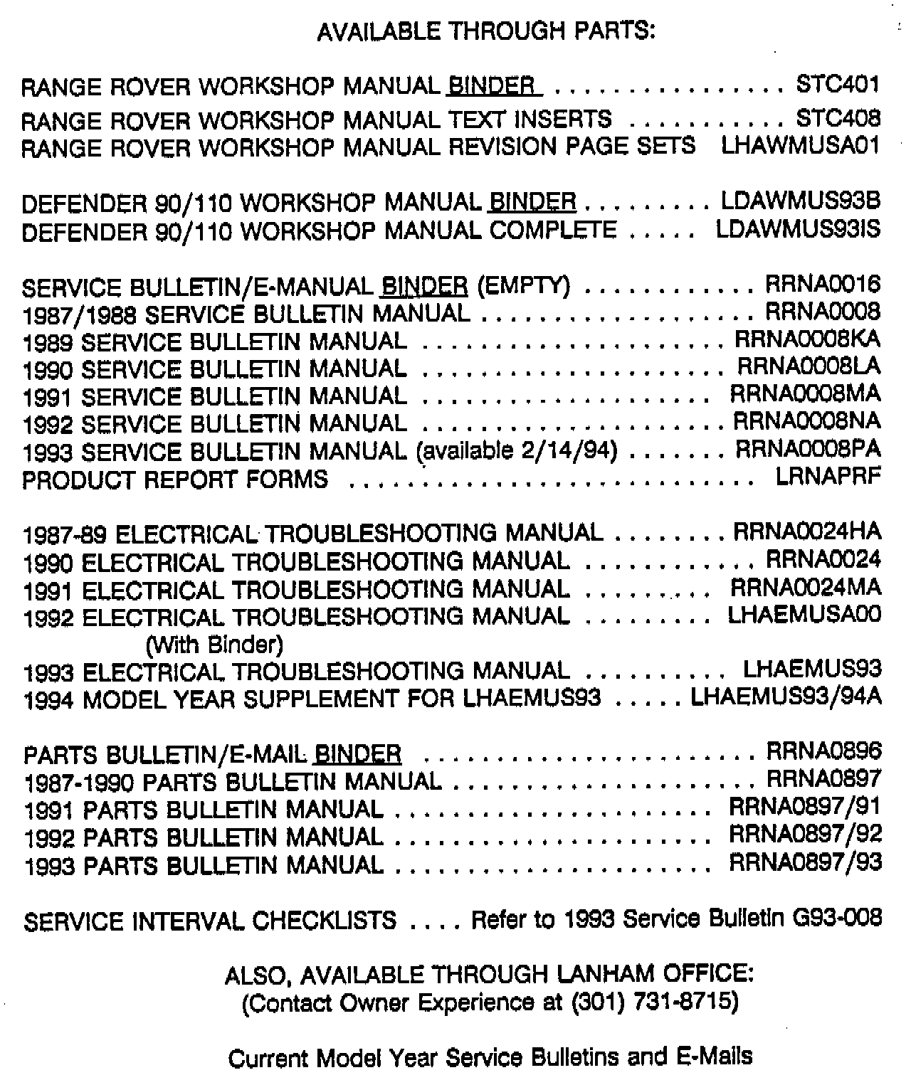 Service - Check first in the Workshop Manual, Electrical Troubleshooting Manual, System Tester Manuals, Service Bulletin Binders, and E-Mail message binder. LRNA has made extensive use of the E-Mail system to provide quick response to product issues and it is a valuable source of information on current and prior model year service issues.