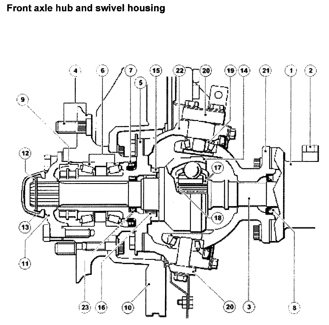 The front wheels are pivoted on tape roller bearings at the top and bottom of the swivel housing. The wheel hubs on all axles are supported by two taper bearings and driven by drive flanges which are splined to the one piece, stub/constant velocity joint.