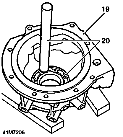 20. Using a soft metal drift, drive output shaft bearing out of housing; discard bearing.