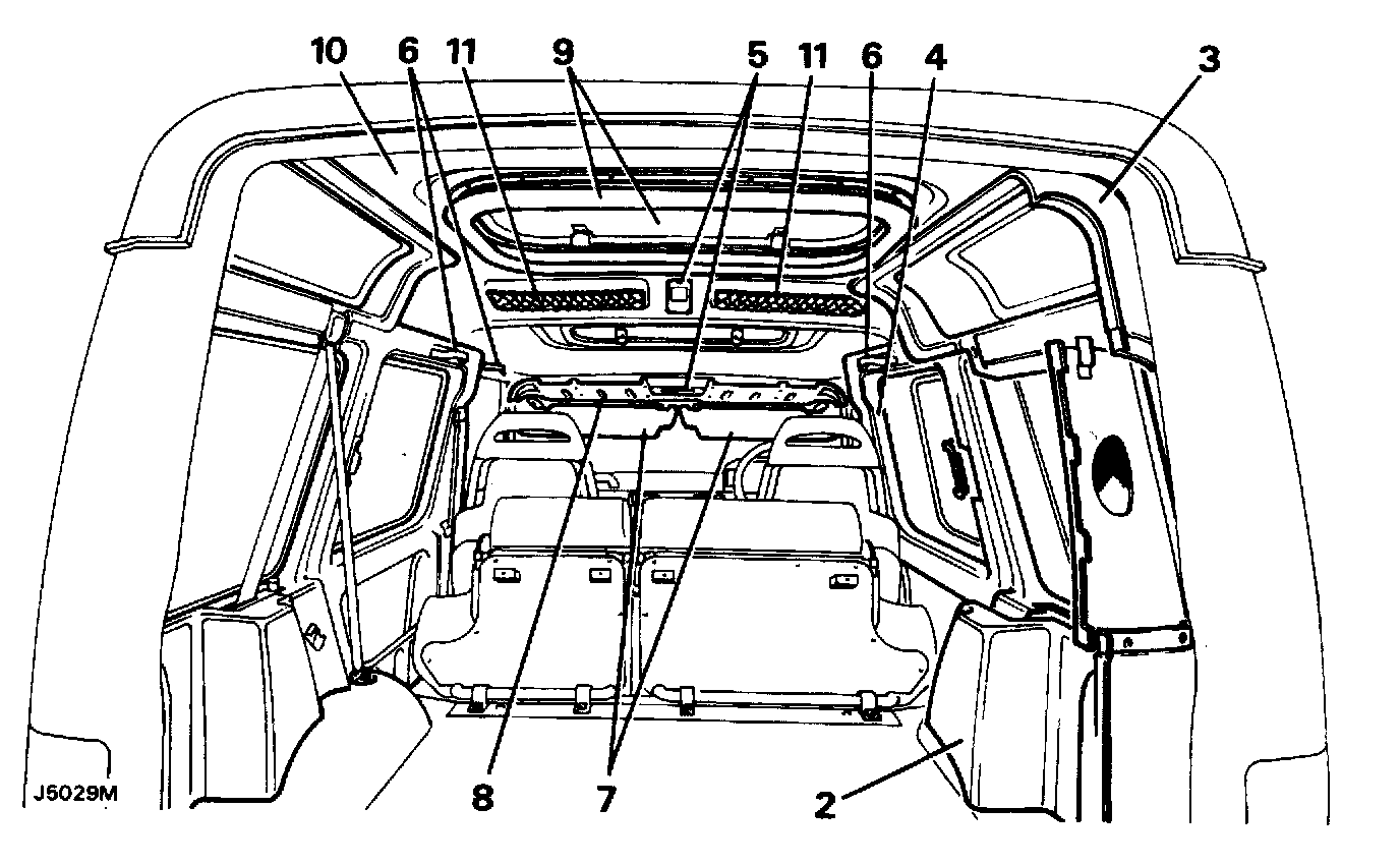 10. Release the headlining from the channel above the rear door and maneuver it from the vehicle through the rear door.