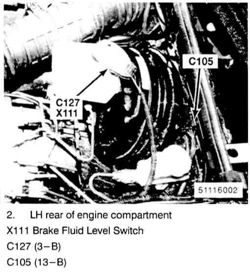 LH rear of engine compartment top of brake fluid reservoir