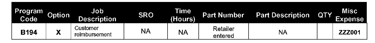 Retailers will directly reimburse the customer. A claim is to be submiffed for recovery of the reimbursement using program code B194 together with Option Code X stating the value of the submiffed customer invoice. Use the miscellaneous repair/cost code ZZZ001.