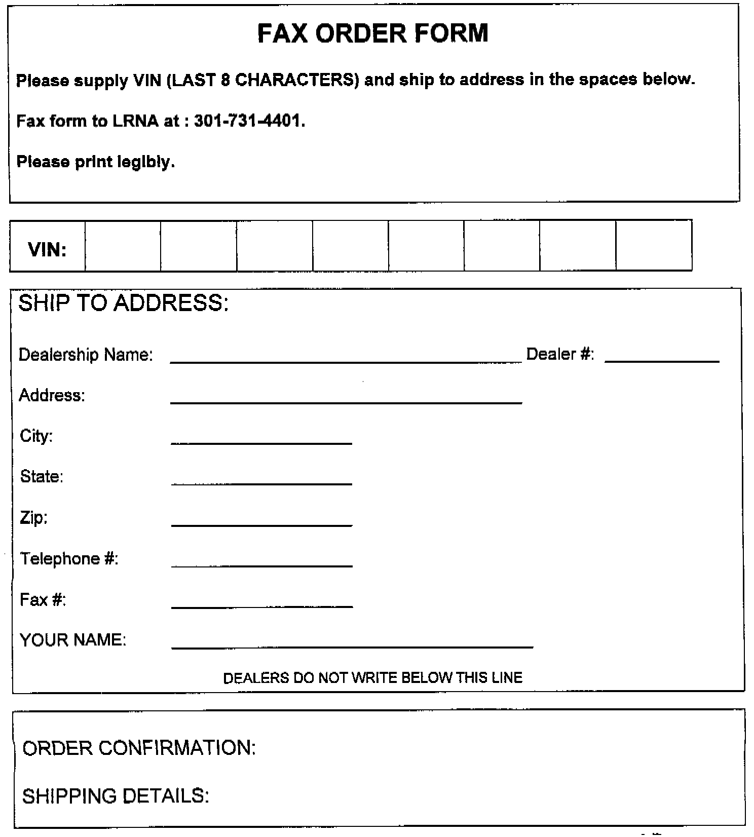 Upon receipt of your faxed order at LRNA, you will receive within 10 business days a new column lock, coded to the vehicles present key. The part will be shipped to you free of charge via a courier service.