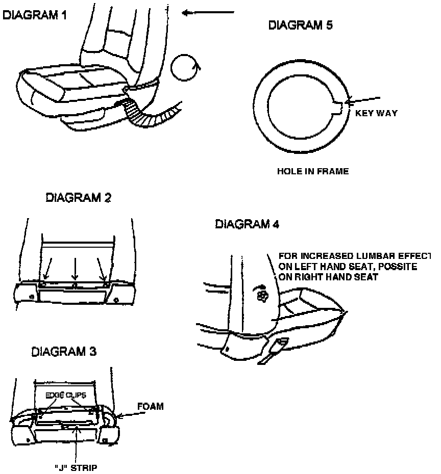 6. The lumbar mechanism can now be carefully removed. Inspect the thread surfaces on both the locking ring and the lumbar control mechanism, replace only if components are damaged. Ensure that the correct hand of lumbar mechanism is installed. This is determined by checking that the handle rotates clockwise on a left hand seat and counterclockwise on a right hand seat while looking at the handle for increased lumbar effect (diagram 4). Also check that the key on the handle end of the lumbar mechanism has engaged with the key hole in the seat frame when the locking ring is tightened (diagram 5). The locking ring should be refitted using Locktite 241 for added security. CAUTION - Work quickly when using the Locktite to ensure the locking ring is fully tightened before the Locktite sets. Hand tighten only.