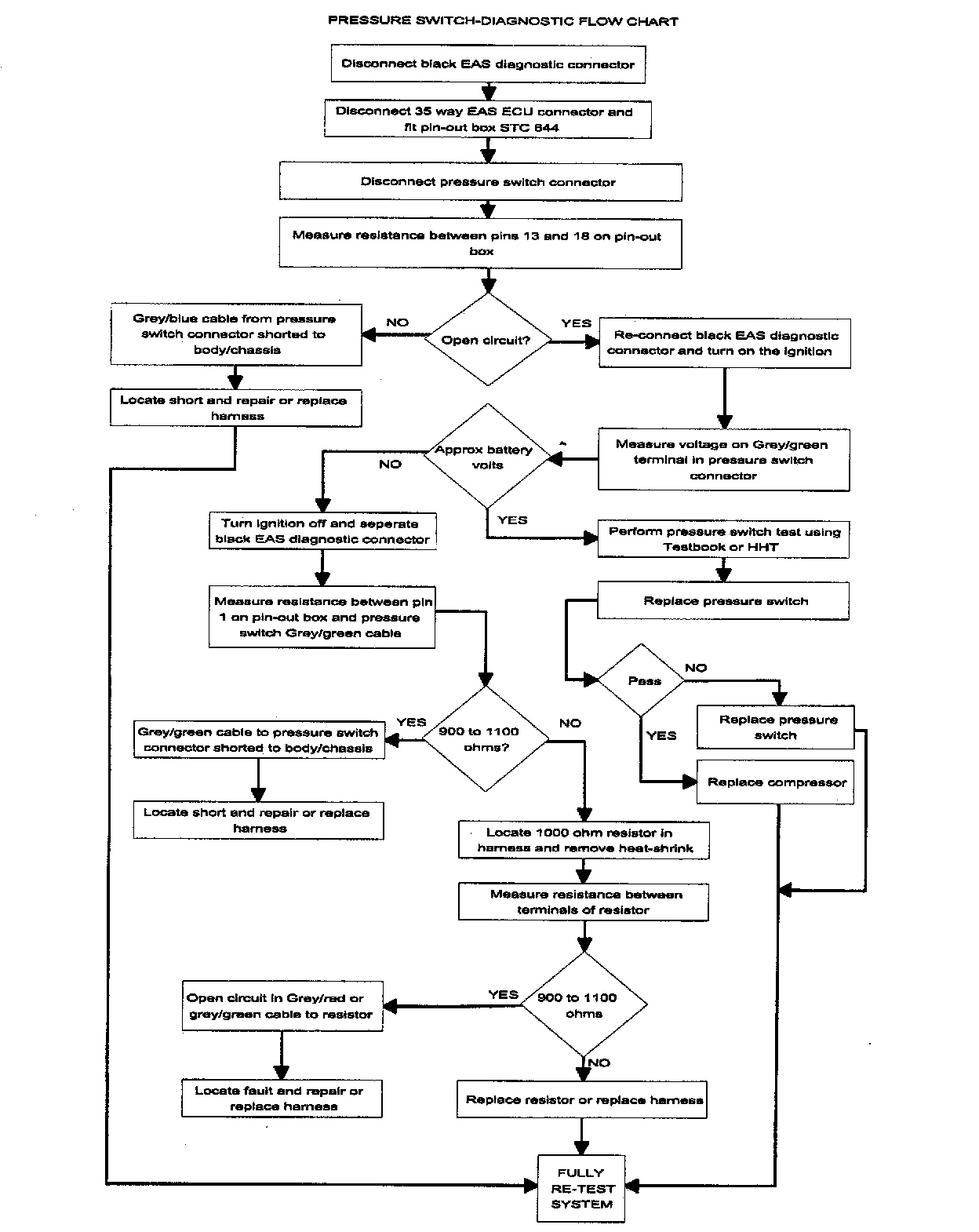 When interrogating the EAS ECU and "Pressure switch stuck off" hard fault is recorded follow the flow chart overleaf to identify the cause of the fault.