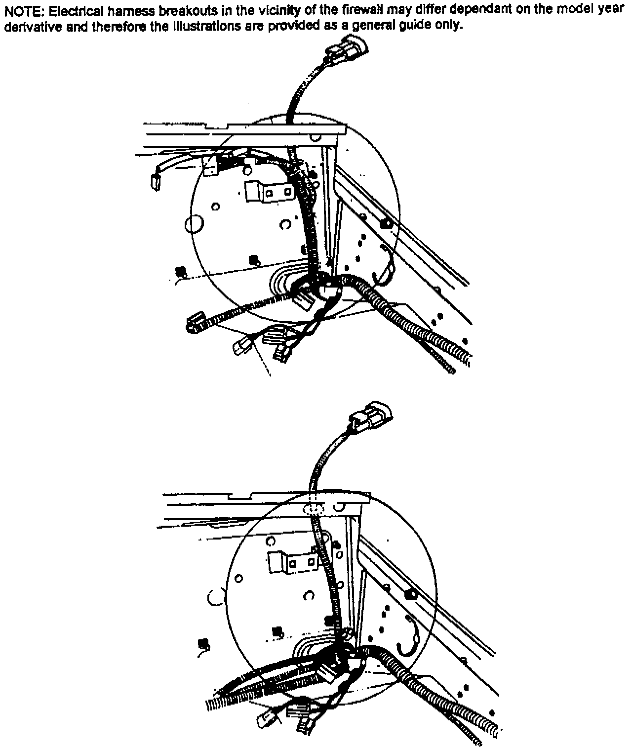 It has been noted that water can enter the inside of the vehicle via the electrical harnesses that pass through the bulkhead. The water entry points are via the engine harness break-outs from the main harness where the tape wrap is incomplete around the breakout points. The water will enter these break-outs and track down the inside of the harness insulation tubing and exit at the first point on the inside of the vehicle. Water can also enter via the harness grommet located in the bulkhead.
