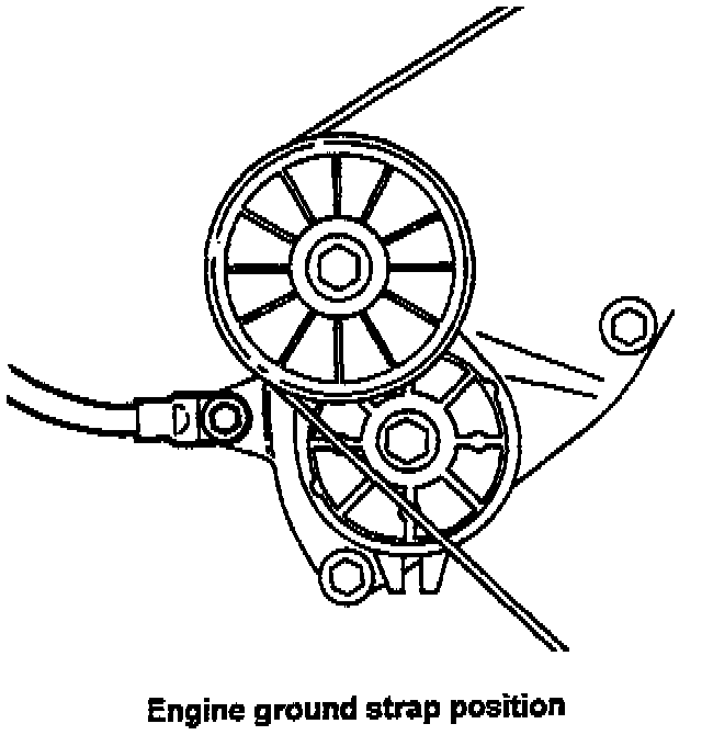 The engine ground is located behind the tensioner pulley on the accessory bracket.