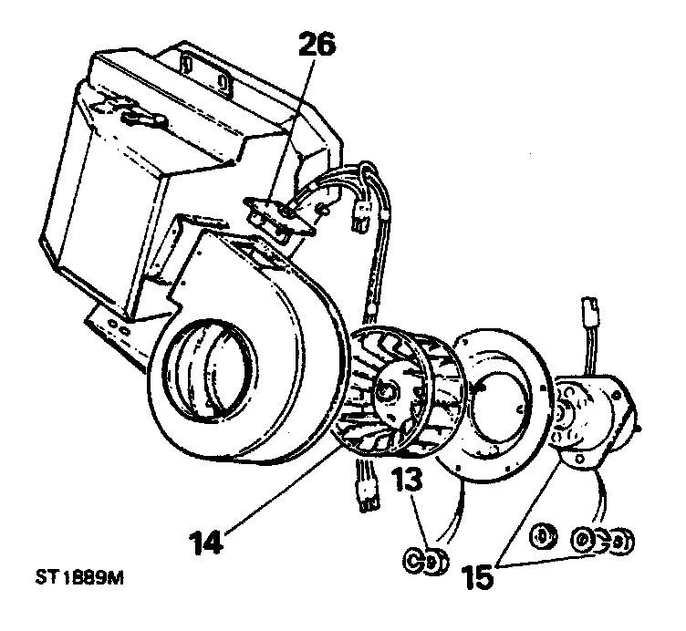 13. Remove the five nuts securing the fan assembly to the heater unit. Unplug the connector and remove the fan assembly from the heater unit.