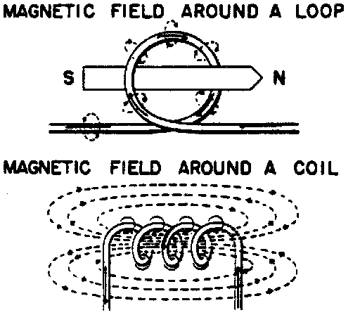 As mentioned, the magnetic field surrounds the conductor, which is carrying an electrical current. If this conductor is formed into a loop, the lines of force on the outside of the loops spread out into space; lines on the inside of the loop are confined and crowded together. This increases the density of lines of force in that area, and a much greater magnetic effect is produced with the same amount of current flowing.