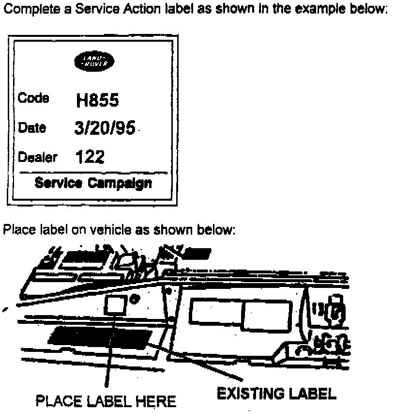 Complete a Service Action Label. Clean an area on the hood locking panel just above the vehicle's emissions label (or another location close to this label). Firmly stick the Service Action label to the panel, and then cover with the clear plastic film as supplied. (see illustrations)