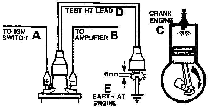 - Remove existing coil/distributor H.T. lead and fit test H.T. lead to coil tower. Using suitable insulated pliers, hold free end about 6 mm (0.25 in) from the engine block and crank the engine. There should be good H.T. sparking.