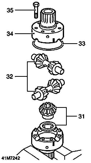 31. Fit a 1.05 mm (0.04 in) thick thrust washer to rear half carrier sun gear, position gear in rear half carrier.
