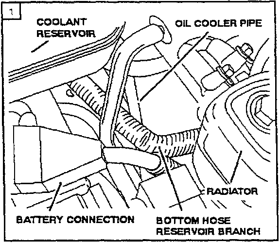 1. Raise hood and verify the branch of the lower radiator hose leading to the reservoir is routed in front of the lower oil cooler pipe (figure 1).