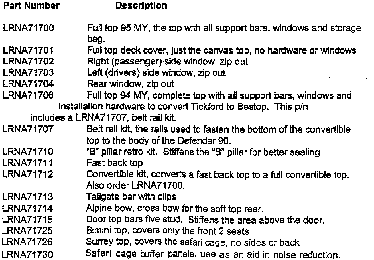 After reviewing claims for Defender 90 convertible top repair it has come to our attention that, in many instances, complete tops (part number LRNA71700) are being utilized when specific parts nee only be replaced. For your convenience listed above are the various part numbers available for the Defender 90 convertible top and their description and care points to be followed when working on Defender 90 tops. For future repairs please ensure that only the necessary parts are replaced when needed.