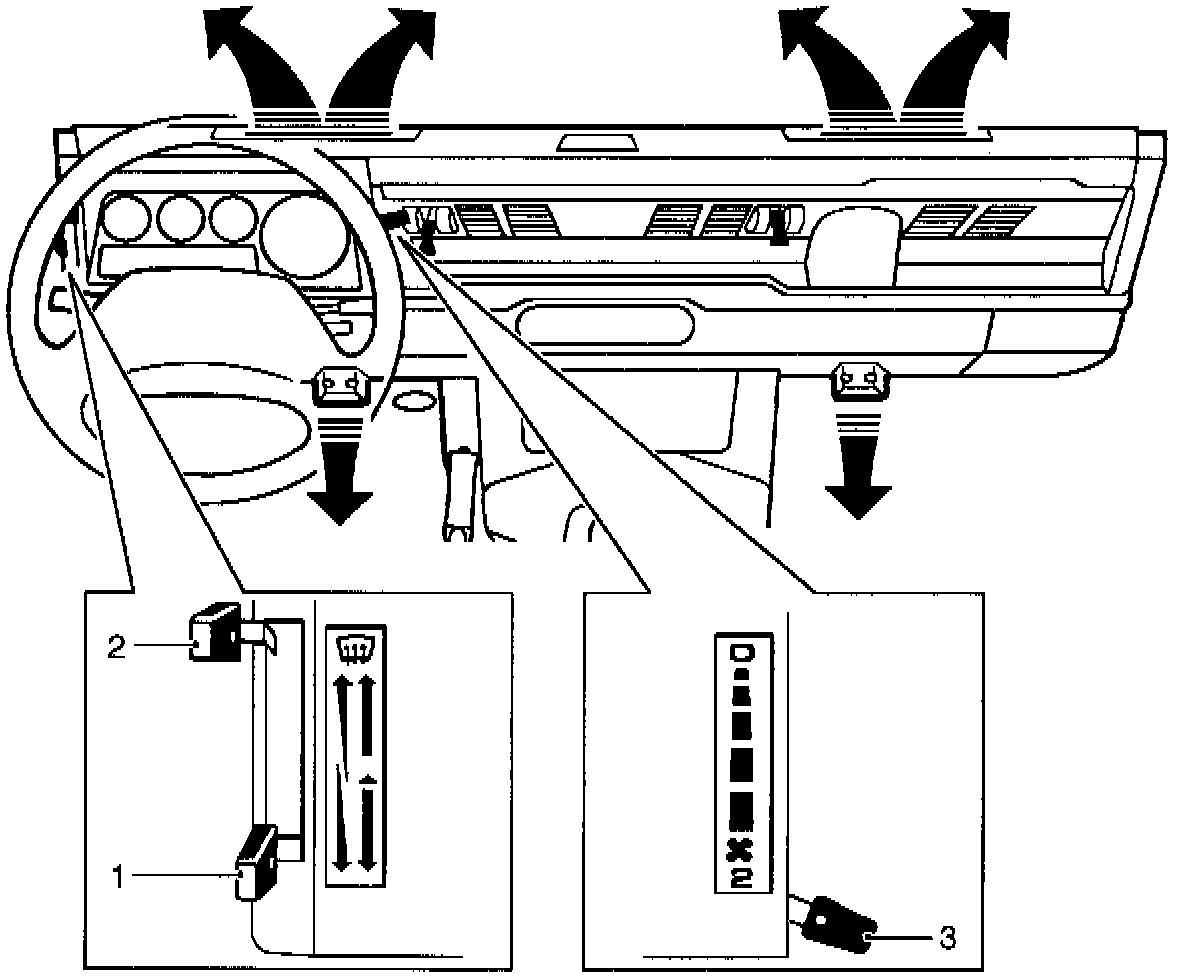 Lever fully up - windscreen vents only. Lever midway - footwell and windscreen vents. Lever fully down - footwell vents.