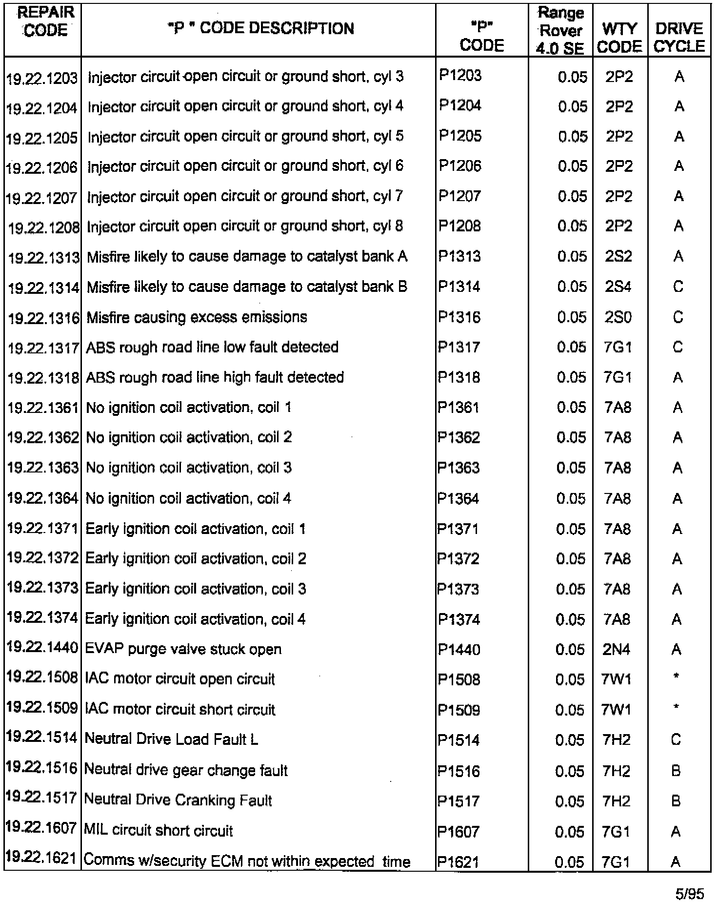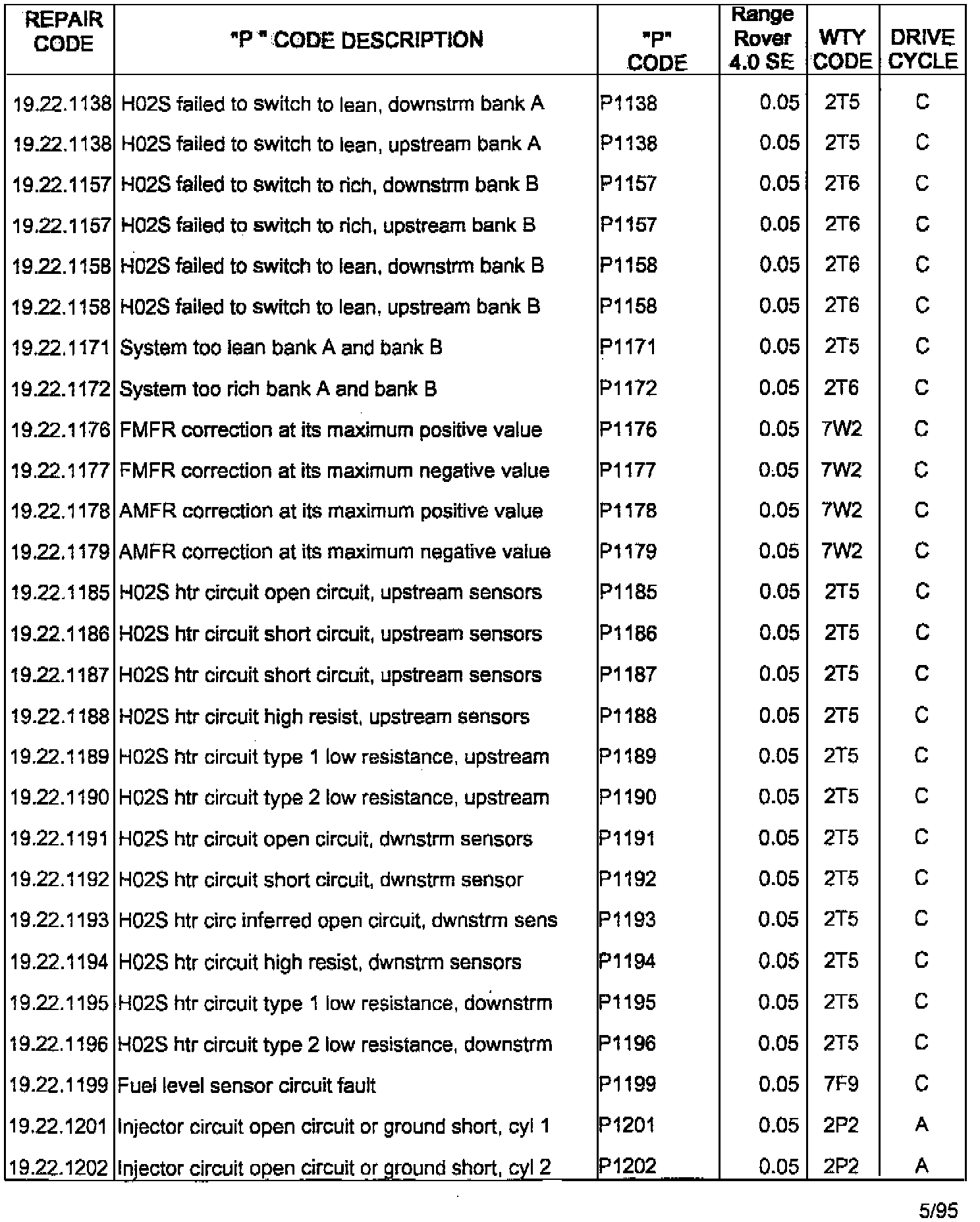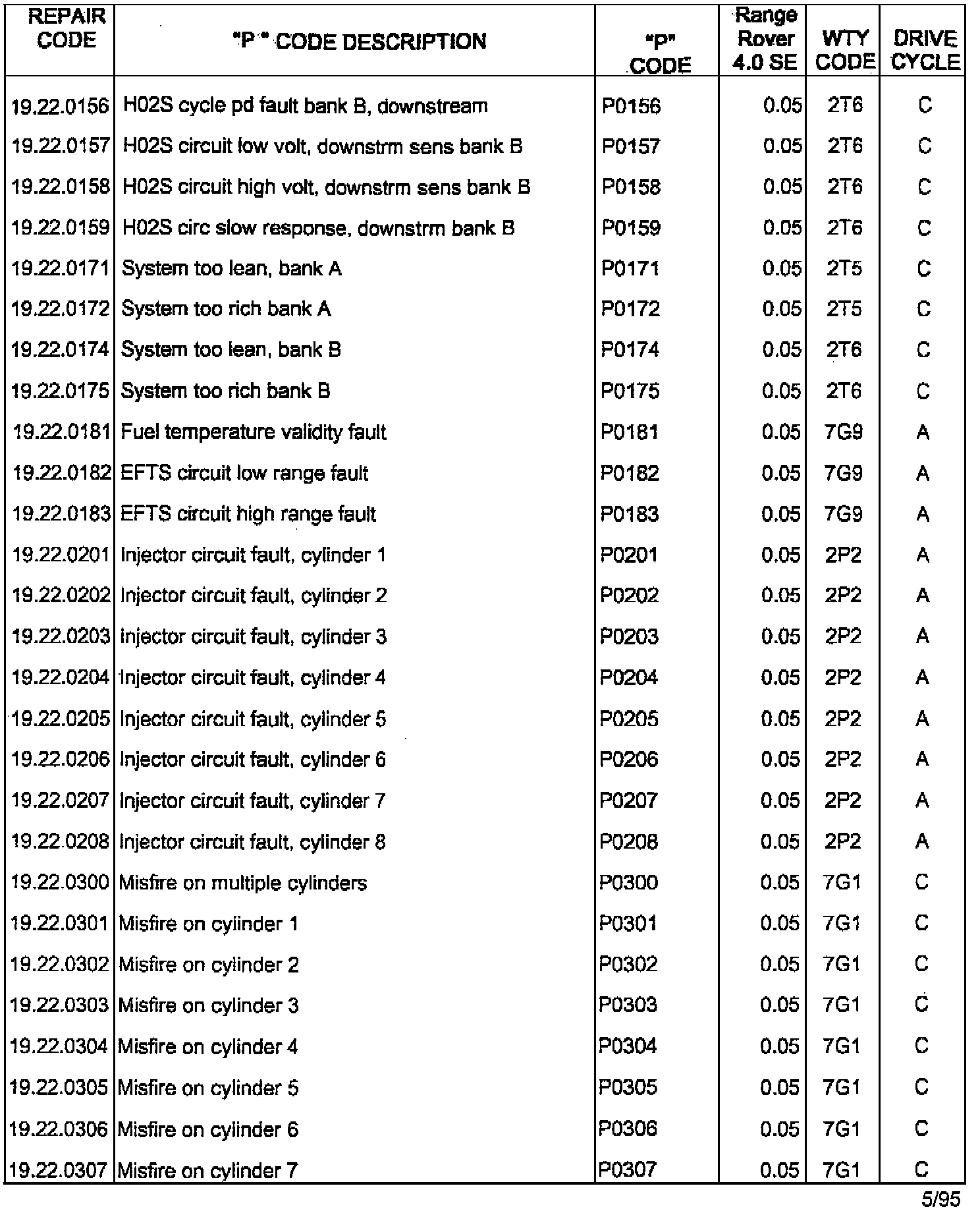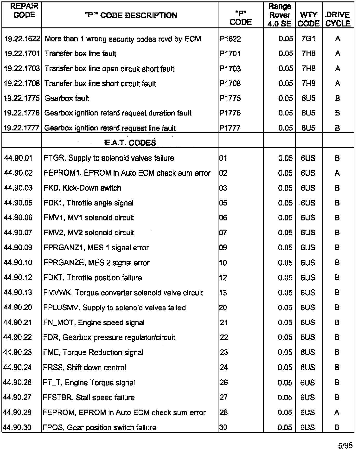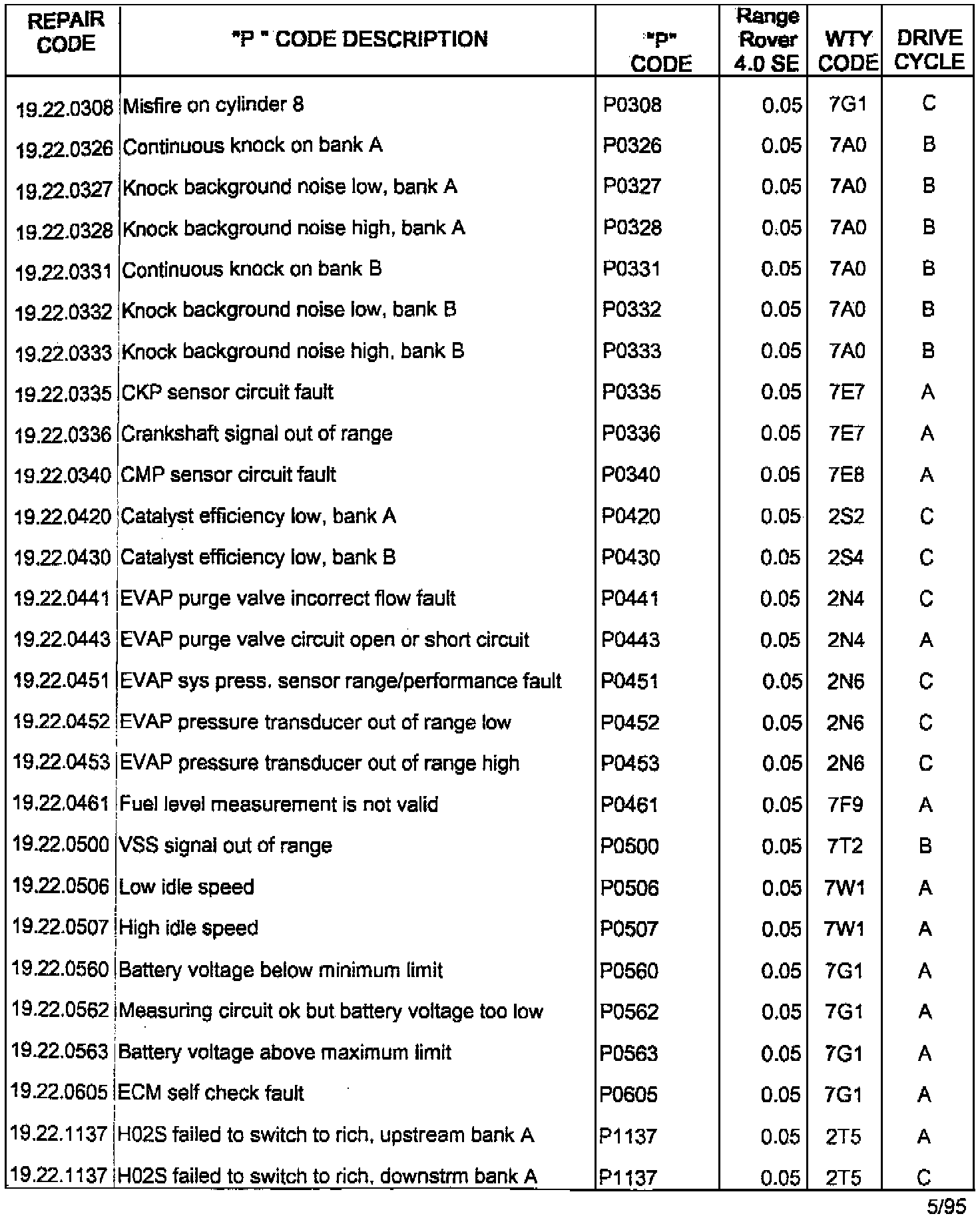 RANGE ROVER 4.0SE/4.6HSE ON BOARD DIAGNOSTIC (OBDII) SYSTEM FAULT CODES