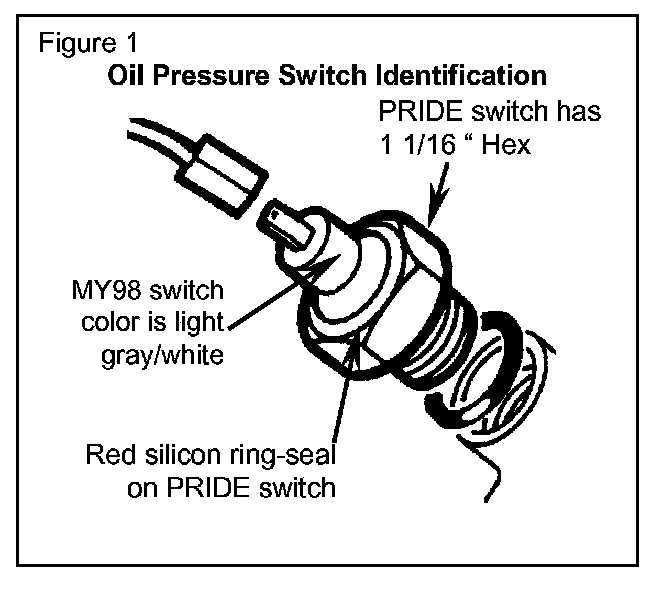 If the oil pressure switch has not been replaced with either a new style pressure switch (light gray insert) or with the PRIDE specified switch (black and red insert), replace the switch with STC4104K.