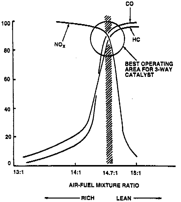Precise control of the air/fuel ratio is critical for effective catalyst operation. The chart below shows that once the mixture moves away from stoichiometric, catalyst efficiency suffers.