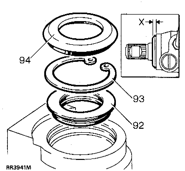 44. Smear inner lip of dirt excluder with grease. Install dirt excluder (94) using installer tool No. LRT-57-027. When installed correctly outer shoulder of excluder is 4.00-4.50 mm, (0.16-0.18 inch) from face of box, dimension -X-.