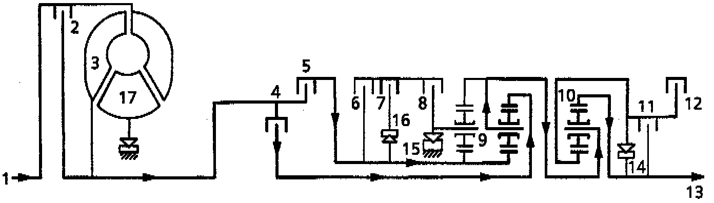 Clutches 4, 5, 7 and 12 are engaged. Freewheel 14, 15 and 16 are overrun. Epicyclic gear set 9 rotates as a solid unit. The hollow shaft with the sun wheel of epicyclic gear set 10 is locked.