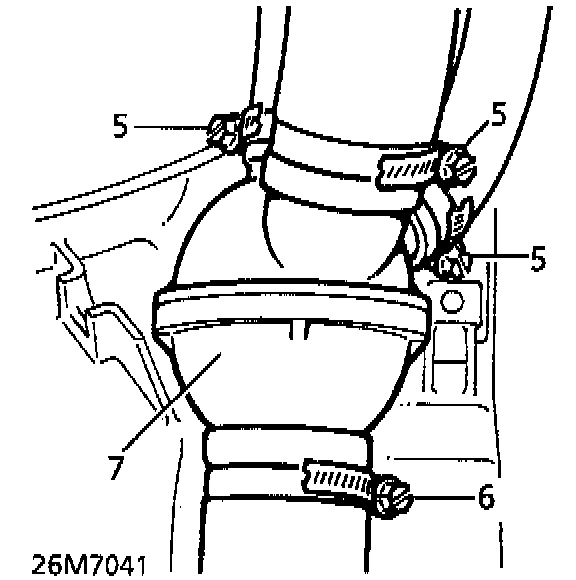 5. Slacken 3 upper hose clips. Disconnect hoses from top of thermostat housing.