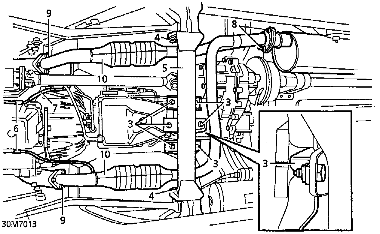 9. Remove 6 nuts securing front pipe to exhaust manifold flanges.