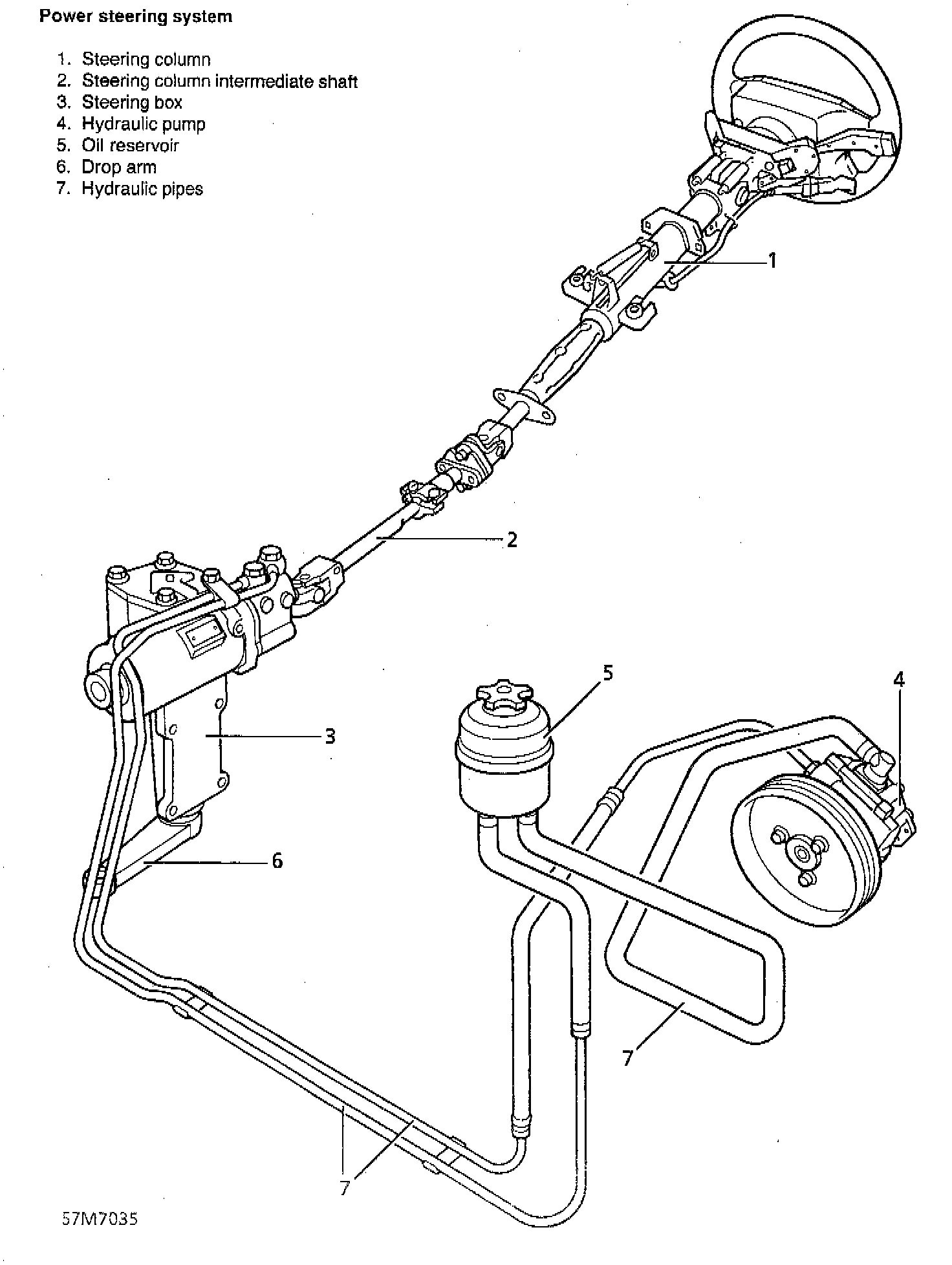 The power steering system consists of an hydraulic pump, a power steering box and a fluid reservoir. The fluid reservoir supplies fluid to the hydraulic pump. This vane type pump is belt driven from the front of the engine. Pressurised fluid flows via a pressure and flow limiting valve to the power steering box. In the steering box, valve spools operated by movement of the steering wheel direct fluid pressure to the appropriate side of the piston to provide power assistance.