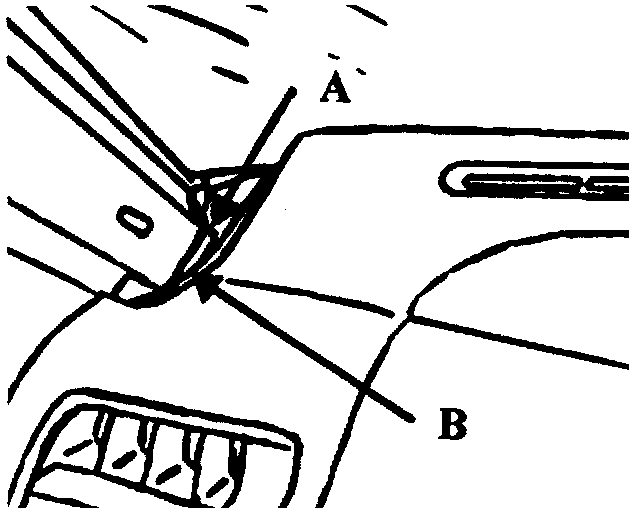 2) Trim the facia edge to give a clearance of 1/16" - 1/8" (2 to 3 mm) from the "A" post lower assembly (see "B" on the illustration).