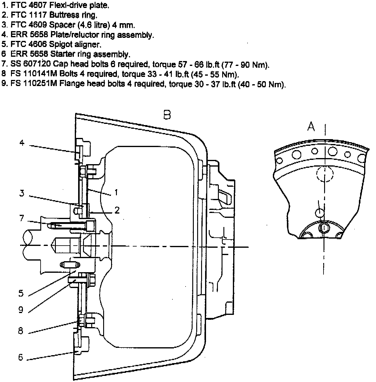 On assembly the flexi drive plate must be fitted the correct way round. The holes in the flex drive plate must line up with the clearance holes in the starter ring plate to enable the torque converter bolt heads to pass through. (shown on illustration A opposite).
