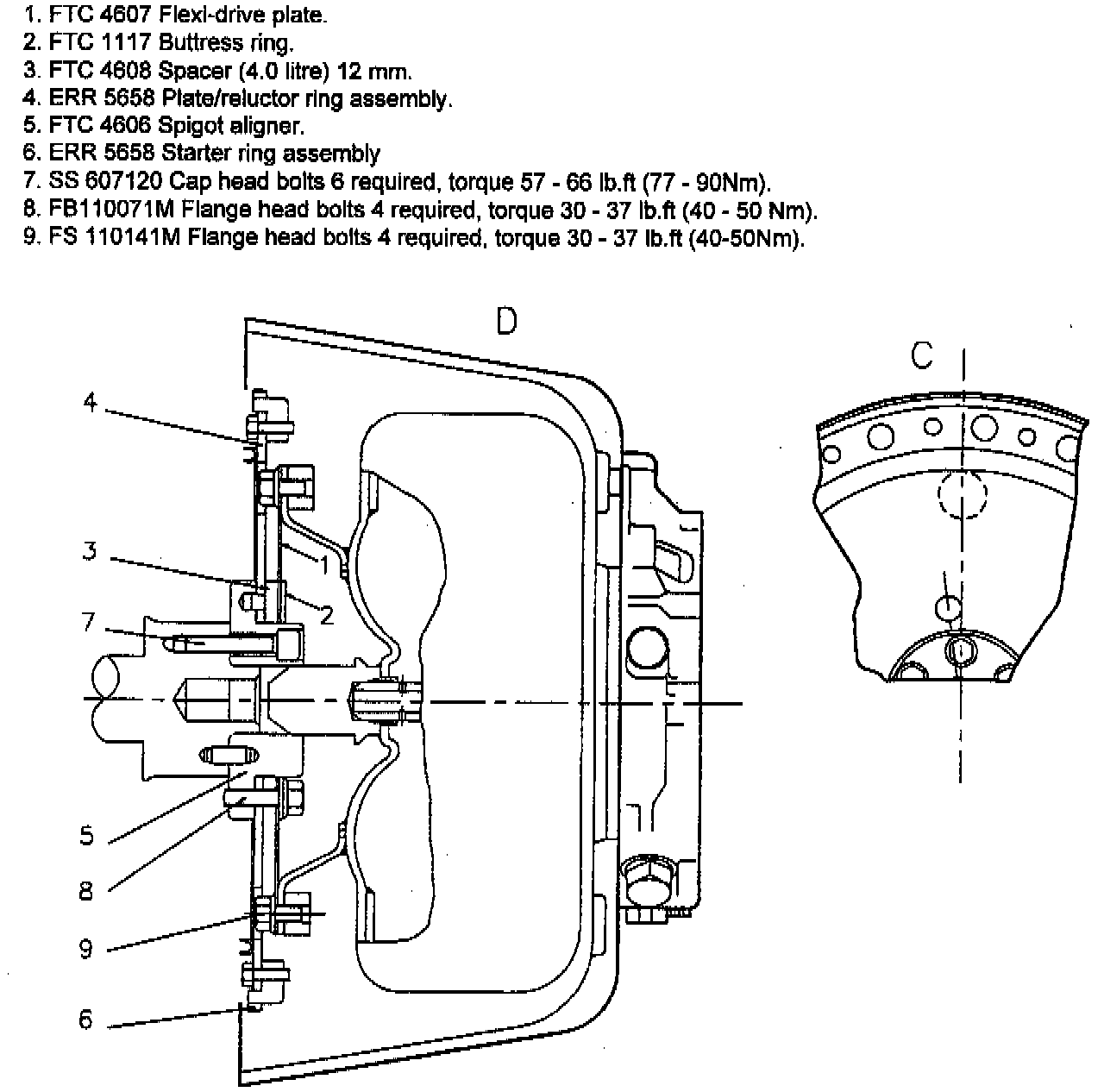 On assembly the flexi-drive plate must be fitted the correct way round. The holes in the flexi drive plate must line up with the clearance holes in the starter ring plate to enable the torque converter bolt heads to pass through. (see illustration C opposite).