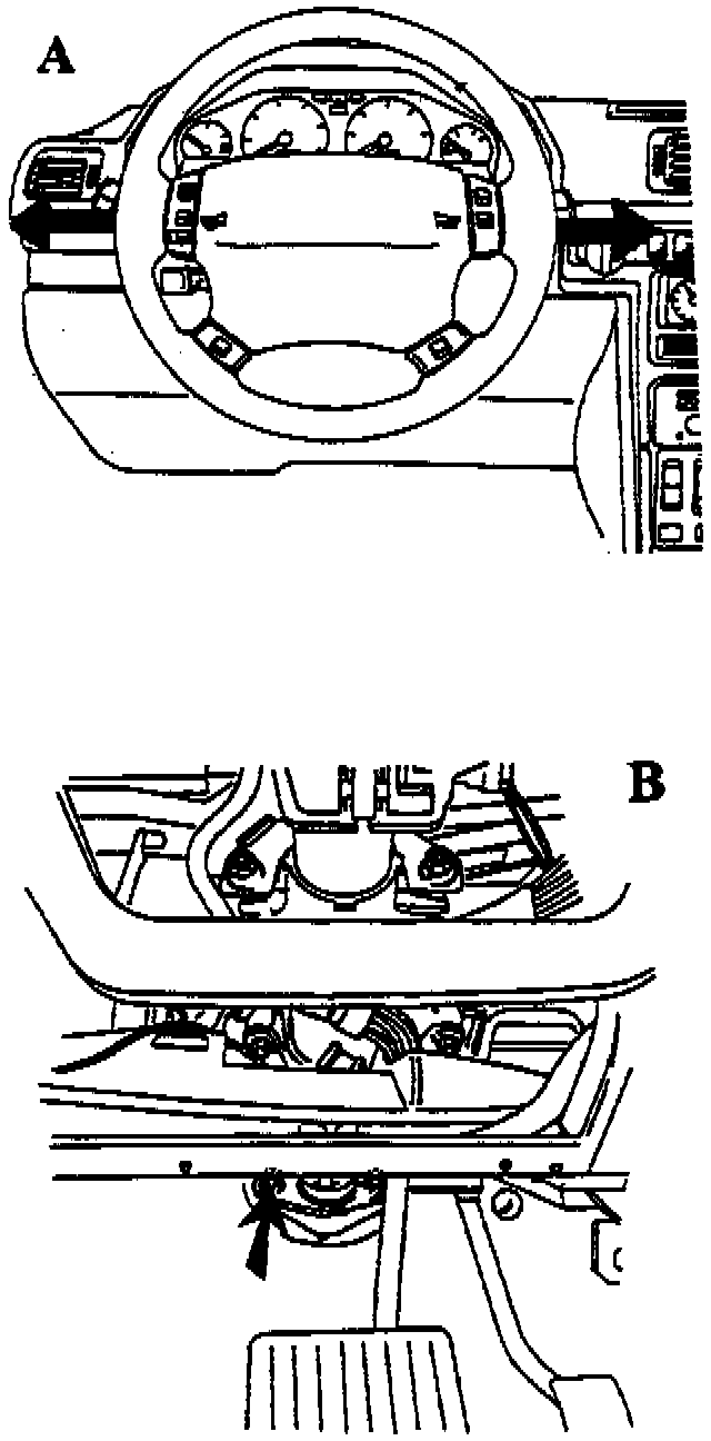 1. Sit in the vehicle and check for a column knock, by holding the steering wheel at each side and moving from side to side (see illustration "A"). Column should be in fully extended position.