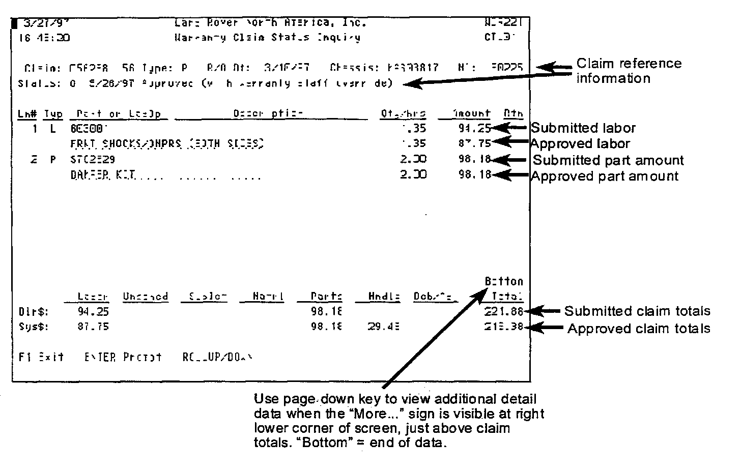 If there is insufficient space on the screen to show all parts, labor, sublet and material lines, a "More..." indicator will be displayed in the lower right hand corner of the screen, just above the claim totals. The additional detail items can be viewed by using the page down key. If all detail lines have been displayed on the same screen a "Bottom" indicator will be displayed instead of the "More..." indicator.