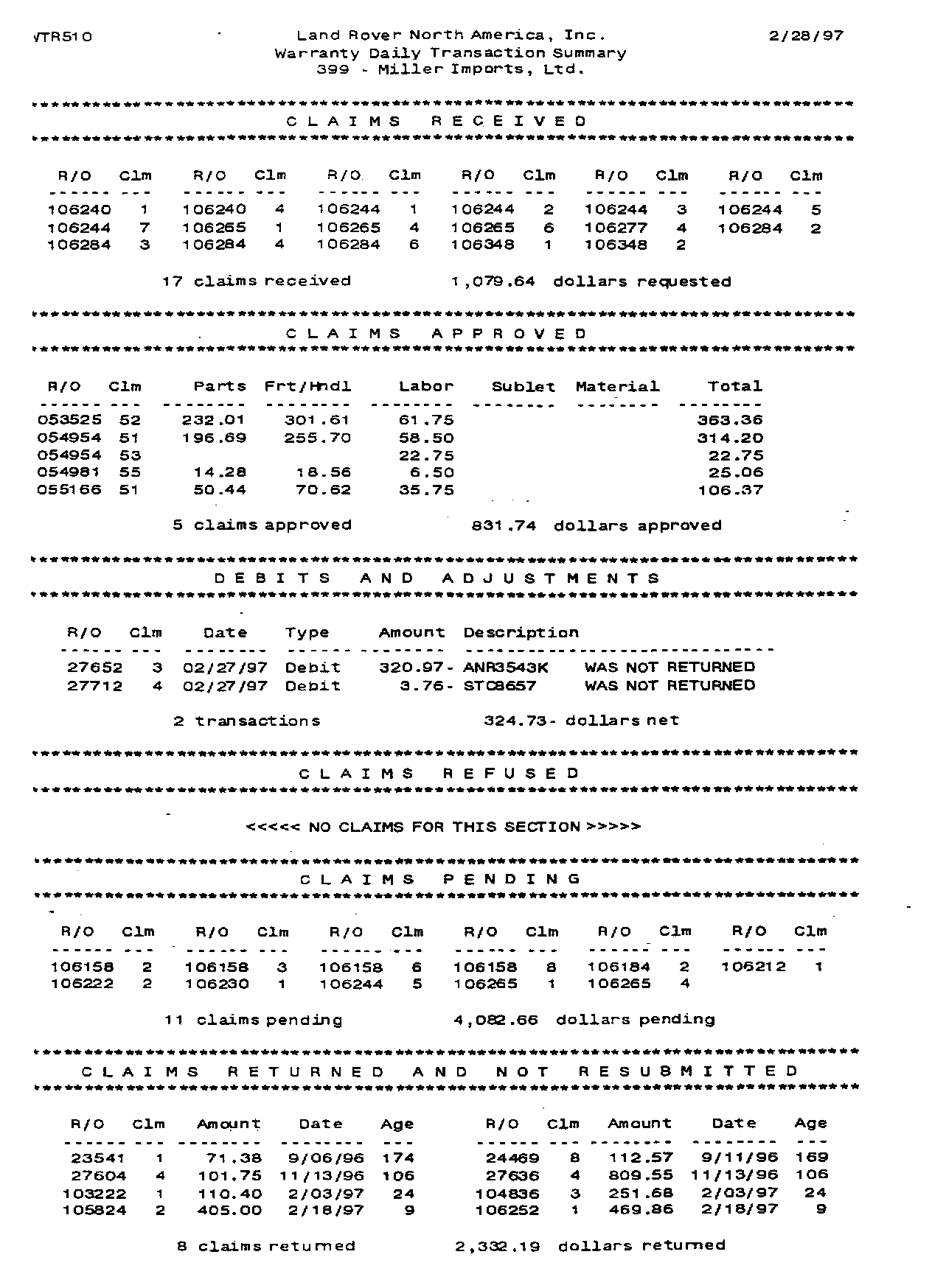 Warranty Claims Approved for Payment: This section lists all warranty claims approved for payment on the relevant report date. Along with the repair order number, claim number and total amount approved, in order to facilitate reconciliation, we have provided separate fields containing amounts paid for parts, handling, labor, sublet and materials. In addition, if a claim has been adjusted and an explanation of the adjustment has been written by a member of the LRNA Warranty Staff, the text will appear beneath the line containing the amounts approved.