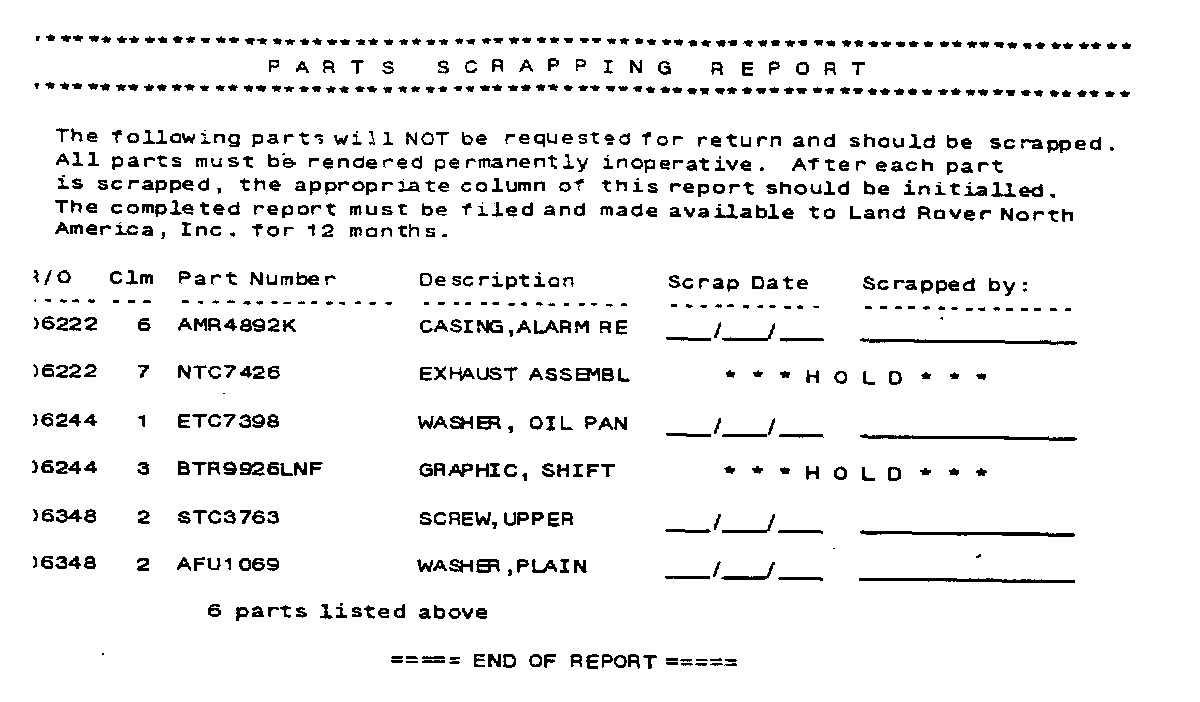 Warranty Parts Disposition Report: This is the final section of the report. Listed in this section are all parts by repair order number and claim number that appeared on claims approved for payment on the relevant report date. Parts on this list with spaces to enter scrap date and initials should be scrapped. The parts annotated with a **HOLD** indicator should be held until parts return tags are supplied by LRNA.