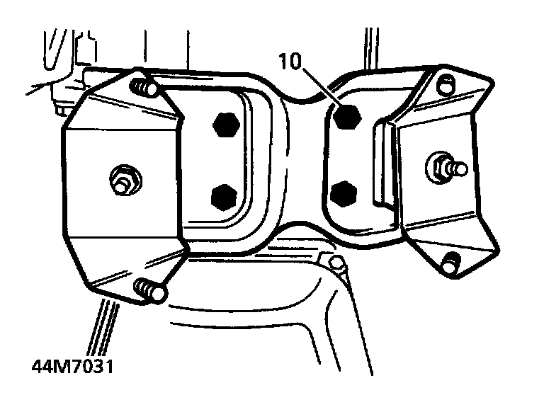 10. Remove 4 bolts securing transmission mounting assembly. Remove assembly.