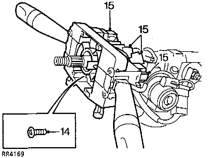 14. Loosen, but do not remove, screw (14) securing column switch assembly, withdraw assembly to gain access to multiplugs (15).