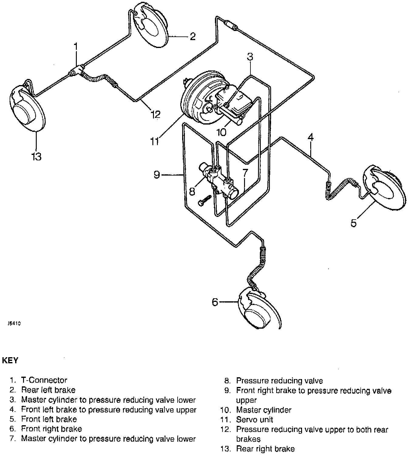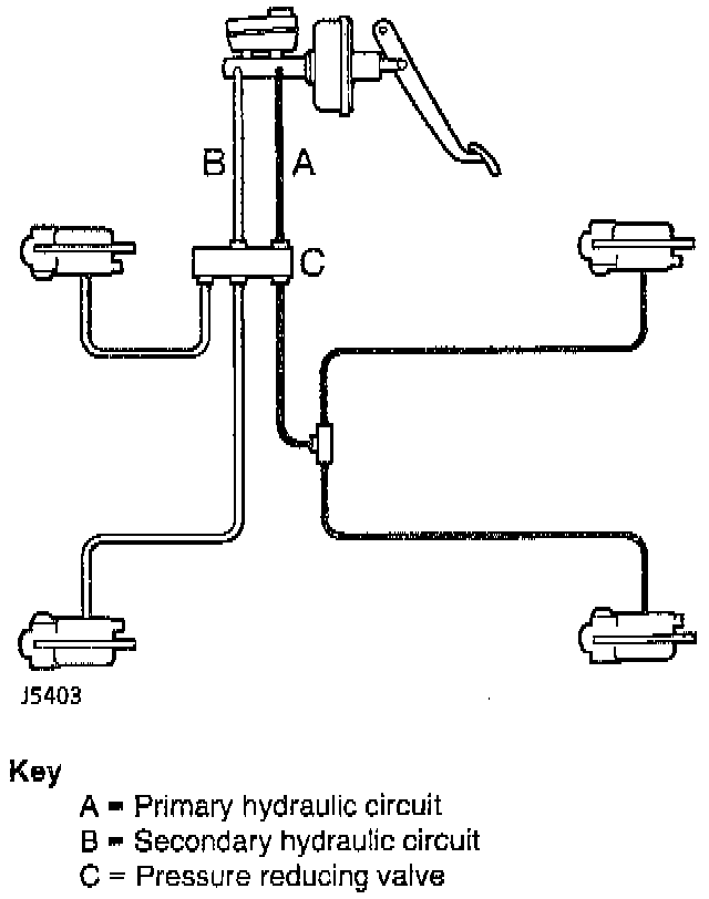 The brake system consists of dual hydraulic circuits in a front - rear split; that is, individual circuits to front and rear axles.