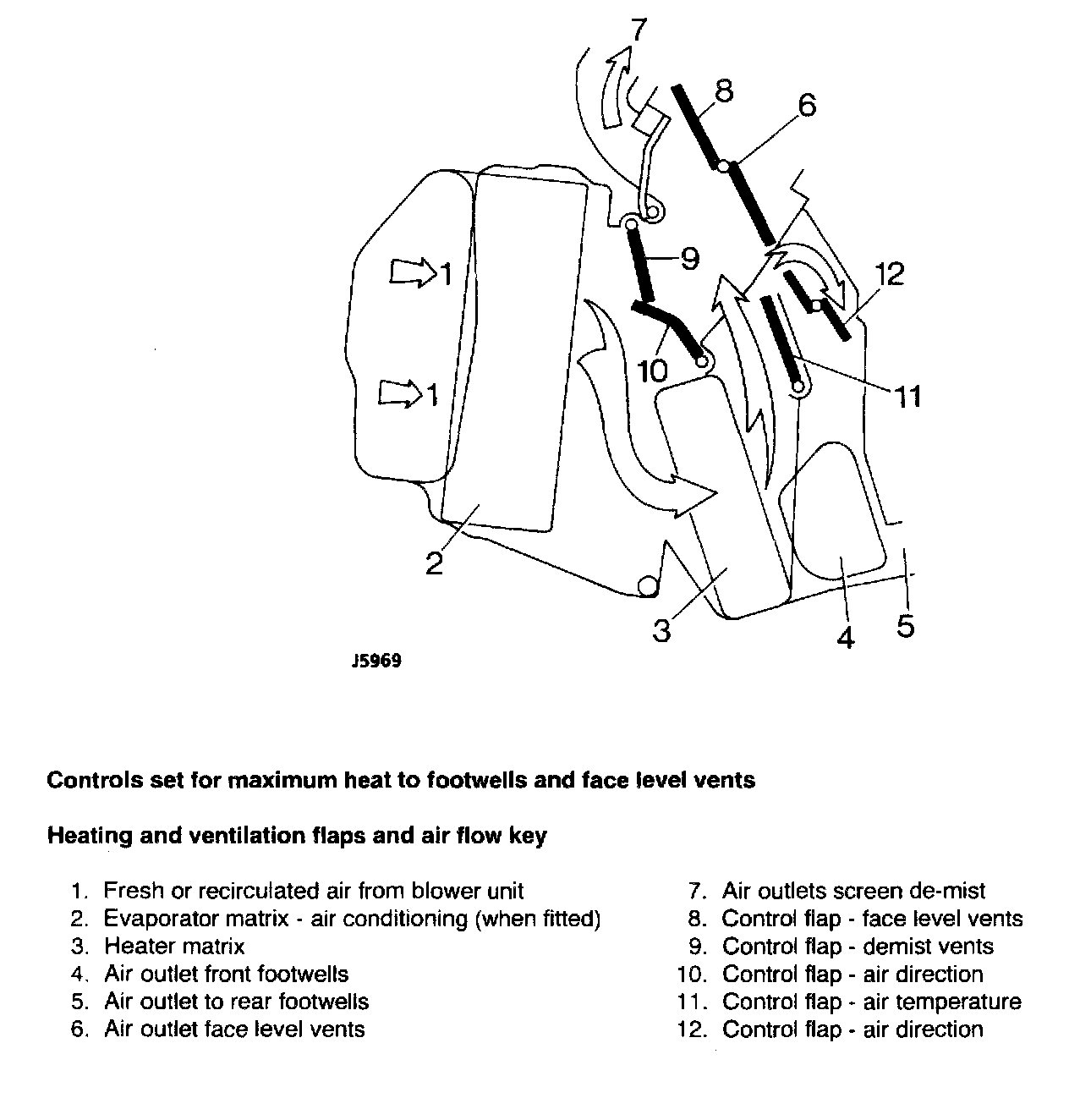 Temperature output is controlled by the temperature controls which move the air direction and temperature flaps independently to increase or decrease the volume of air flow through the heater matrix.